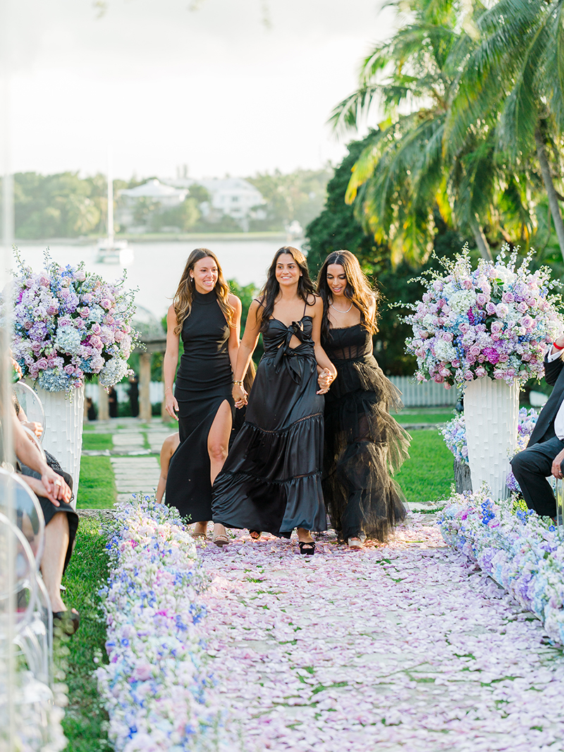 For the wedding day, the men embraced classic black tie attire. However, each one paired his tuxedo with Jordans — a playful nod to the bride’s name. Meanwhile, the bridesmaids wore individually selected black dresses, creating a fashion-forward yet cohesive look.