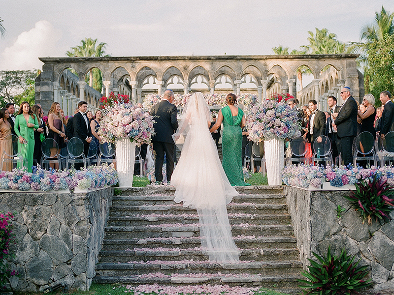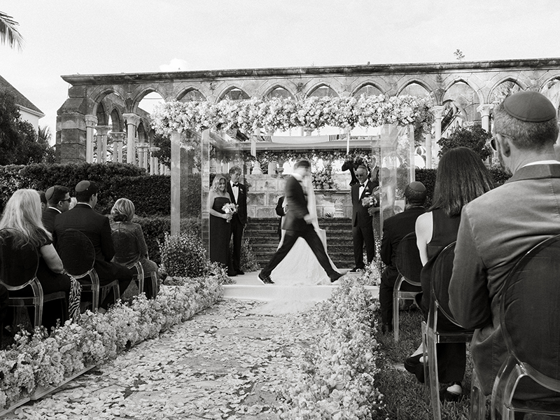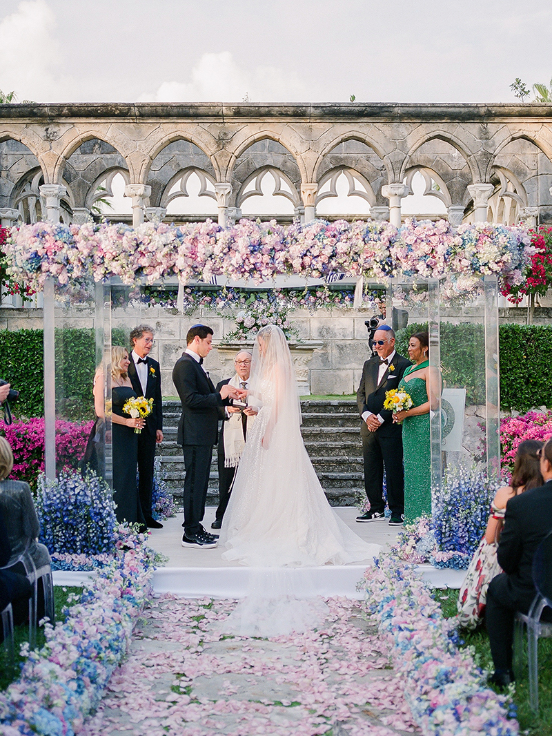 Later in the afternoon, guests assembled at the historic Cloisters overlooking the ocean. Pastel blooms lined the aisle and framed an elegant chuppah at the altar.