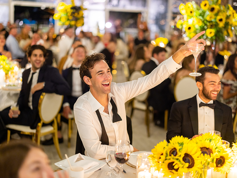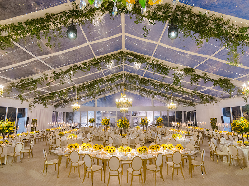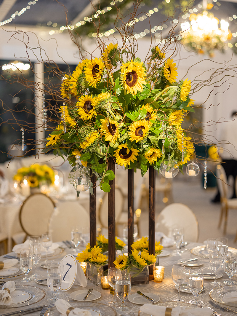 As dusk settled over the property, guests moved into a custom-built reception tent designed entirely by EKS Events. Because sunflowers are Jordan’s favorite bloom, the team draped the ceiling with cascading installations in dramatic abundance.