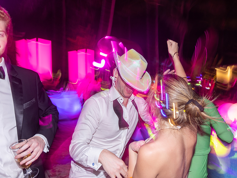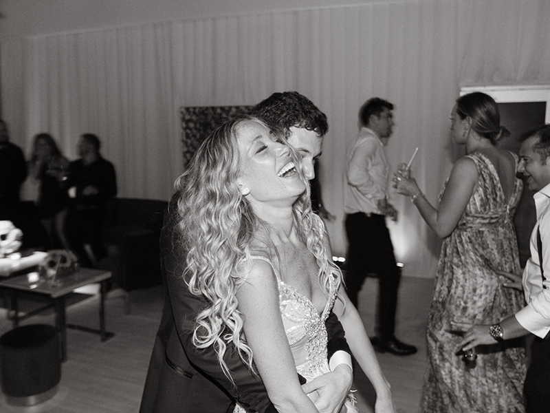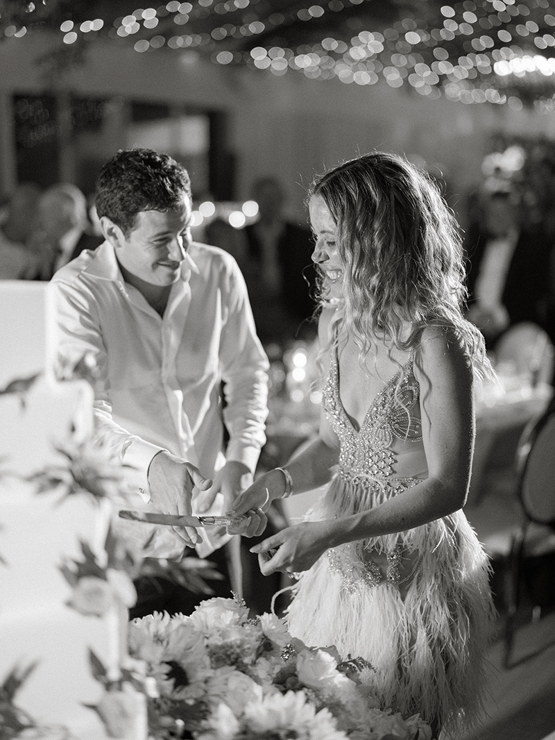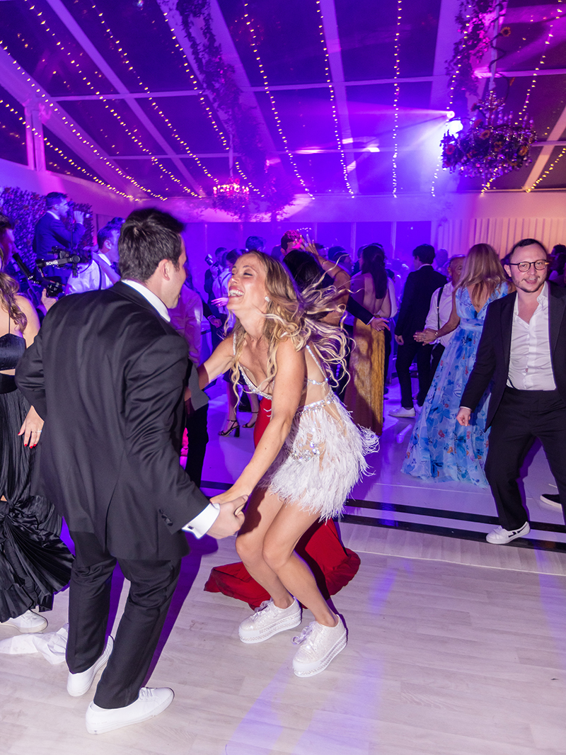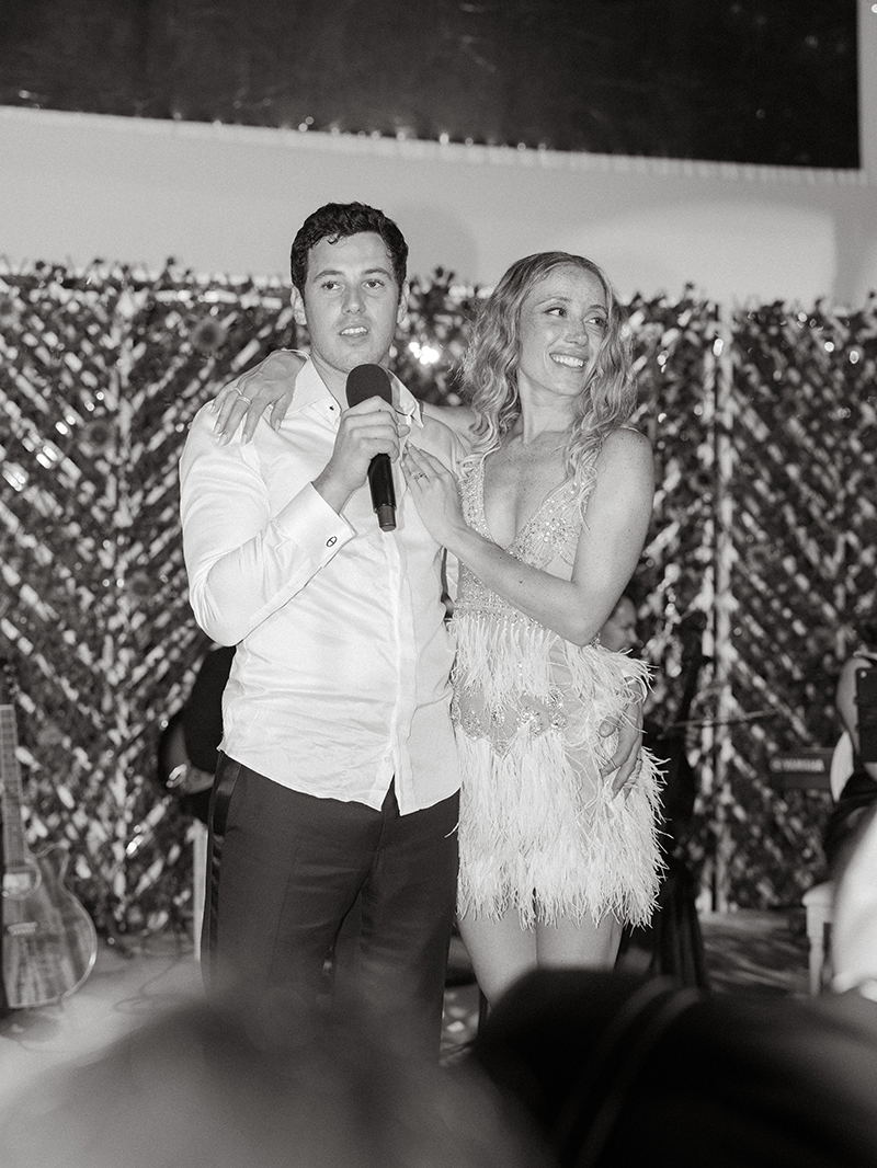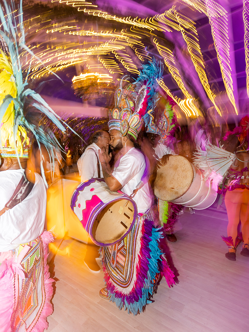 Later in the evening, Jordan changed into a feathered and embellished mini dress that perfectly suited the Bahamas setting. Finally, once dinner and dancing concluded, guests were ushered poolside to the vibrant sound of Junkanoo musicians. There, beneath the stars, the celebration continued into the night.